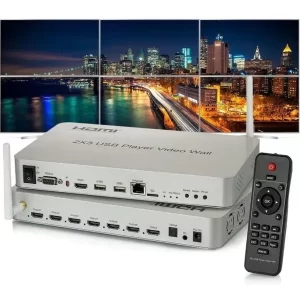 * Ele possui uma entrada HDMI e 9 saídas HDMI e mais uma saída de Áudio de 3.5mm (p2). Este controlador possui 10 funções de paredes de vídeo (Wall vídeo): 1×4, 2×1, 2×2, 2×3, 2×4, 3×1, 3×2, 4×1, 4×2