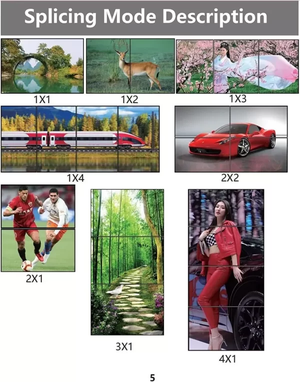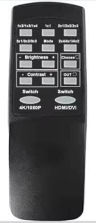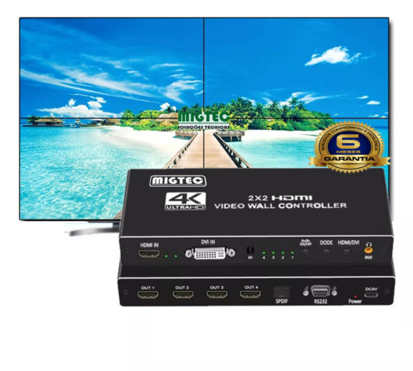 * Ele possui duas entradas distintas: HDMI e DVI e 4 saídas HDMI e mais uma saída de Áudio de 3.5mm (p2).Este controlador possui 6 funções de paredes de vídeo (Wall vídeo): 2×2 / 1×2 / 2×1 / 3×1 / 4×1 / 1×4
